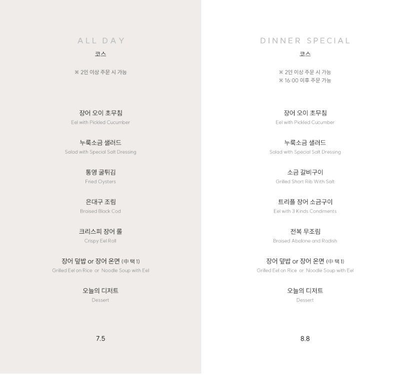 코스요리도 준비되어 있는데 , 점심 코스는 75,000원 저녁코스는 88,000원입니다.