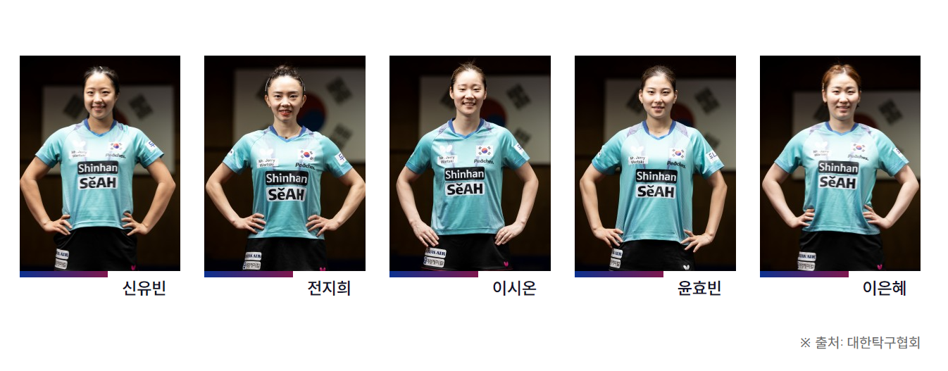 여자 선수로는 신유빈, 전지희, 이시온, 윤효빈, 이은혜 선수입니다.