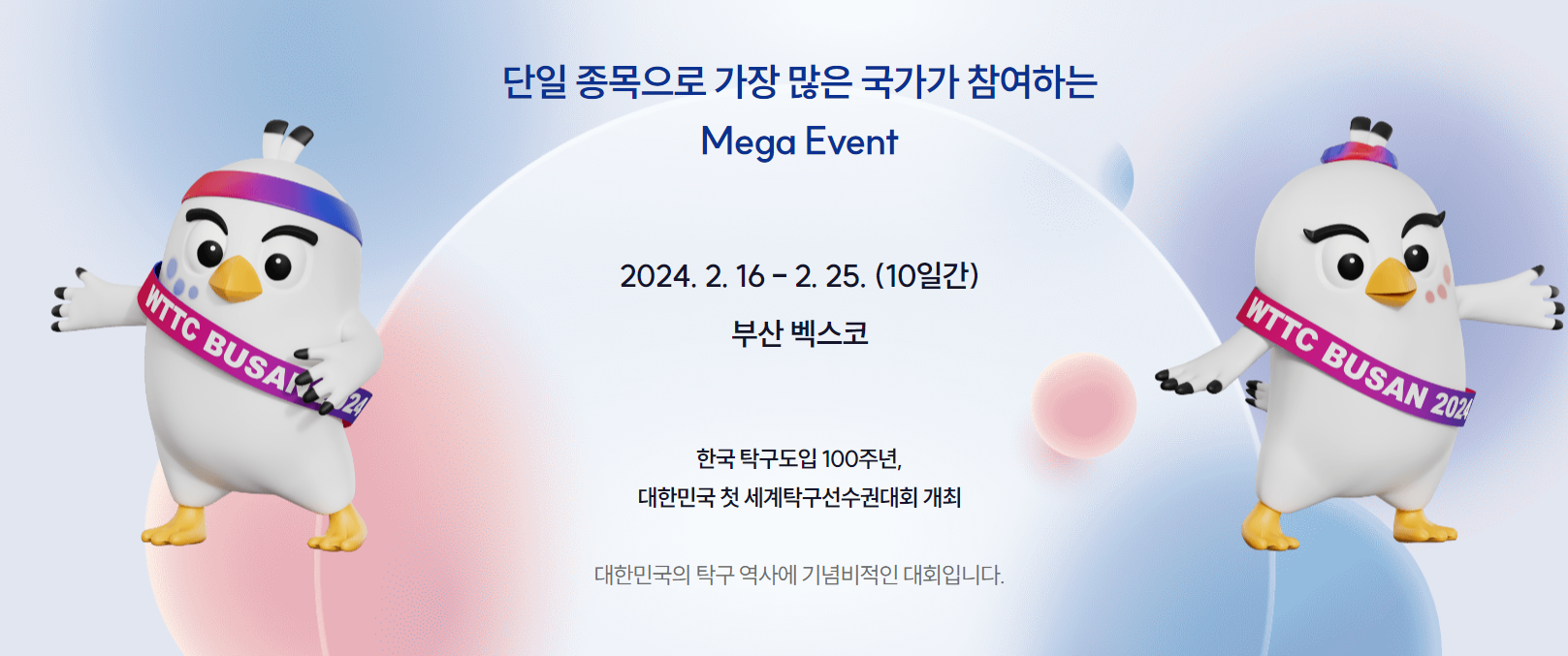 우리에게 축구 월드컵이나 WBC는 잘 알려져 있는데, 실제로 단일 종목으로 가장 많은 국가가 참가한다는 세계탁구선수권대회는 생소하긴 합니다. 우리나라에서 한국 탁구도입 100주년을 맞이하여 처음으로 탁구 역사의 기념비적인 대회과 부산에서 열리니 많은 관심 부탁드립니다.