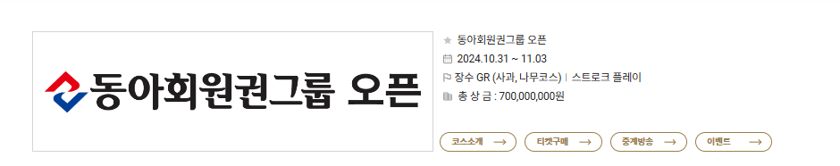 2024년 KPGA투어 신설대회인 동아회원권그룹 오픈이 전북지역에서 개최됩니다. 동아회원권 그룹은 이번 대회를 개최하는 것이 처음은 아니며, 2017년 동아회원권그룹 다이내믹 부산오픈 2018년 동아회원권그룹 부산 오픈을 개최한 기록이 있습니다. KPGA투어 - 동아회원권그룹 오픈 2024 대회일정 : 2024.10.31.~11.03.대회장소 : 장수 GR , 파71 . 7165야드 사과, 나무코스 대회방식 : 스트로크 플레이 총상금 : 7 억원 중계 : 네이버골프 , SBS GOLF 2 신규 대회장소 및 신규로 개최된 KPGA 대회인 동아회원권그룹 오픈입니다. 현재 리더보드 KPGA투어 - 동아회원권그룹 오픈 2024 출전선수 KPGA 간판스타들이 많이 출전하며, 또한 제네시스대상 ..